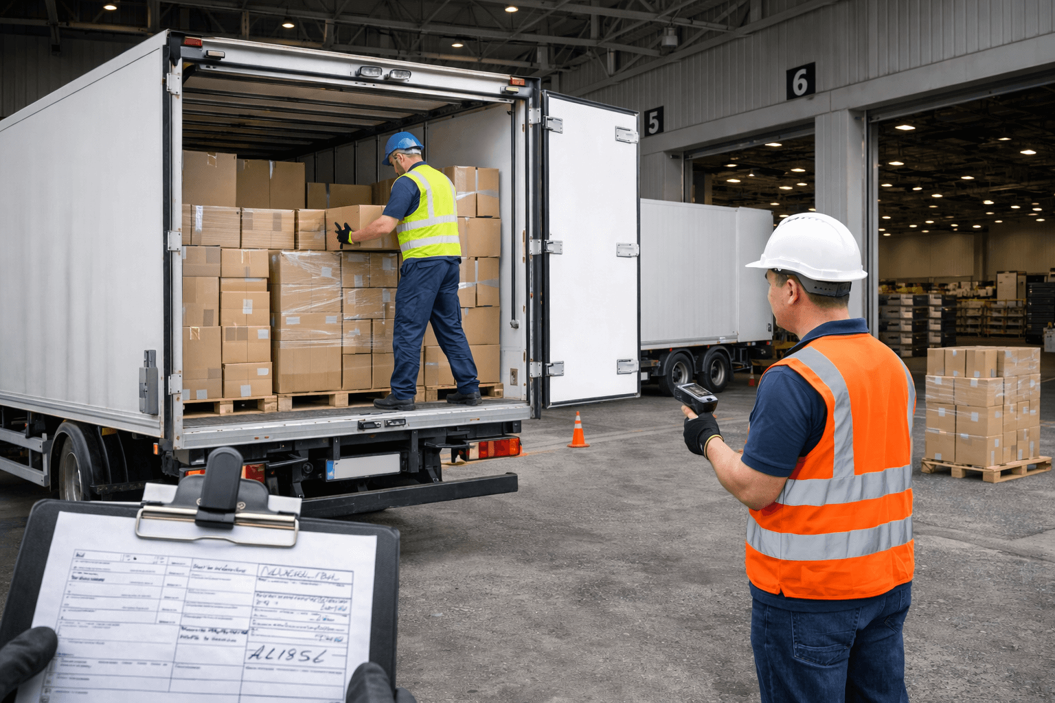 ─ Водитель делает фото на рампе как подтверждение поставки и состояния груза.