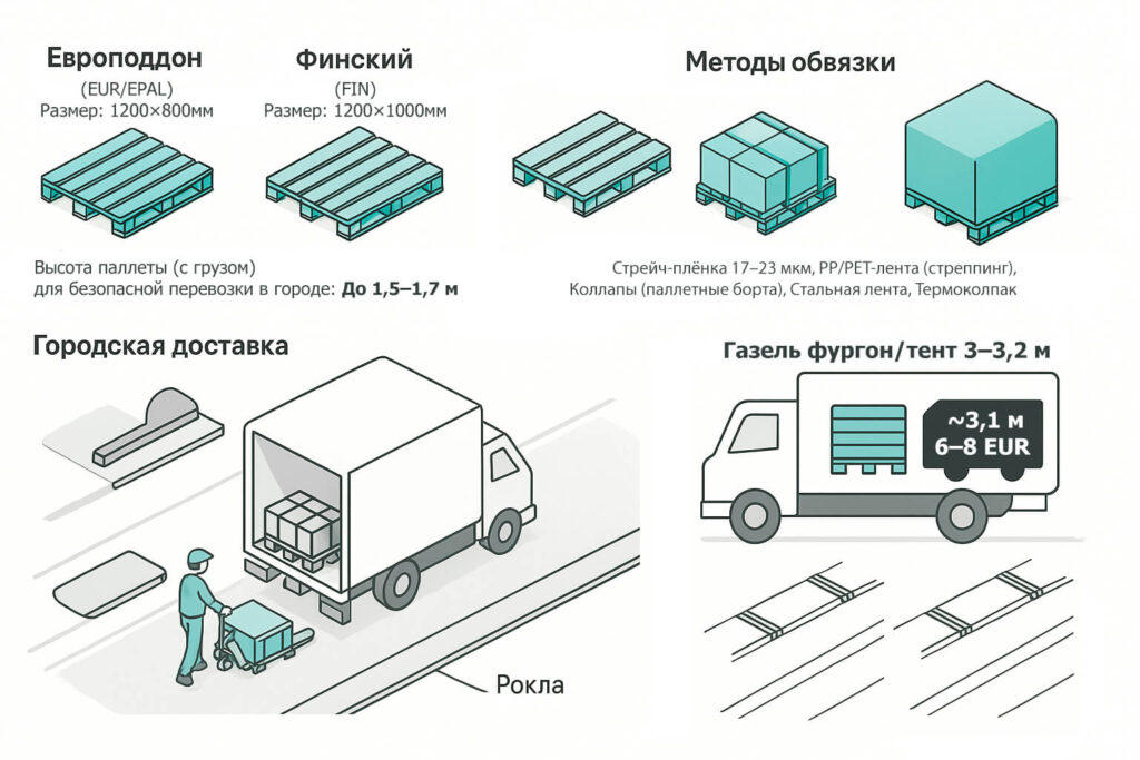 Правильный выбор формата поддона и грамотная обвязка — это цена безопасности и предсказуемых сроков в городе. Расскажите нам про ваш груз и адреса — мы предложим схему паллетизации и оптимальный авто, рассчитаем, сколько паллет встанет и как лучше закрепить.